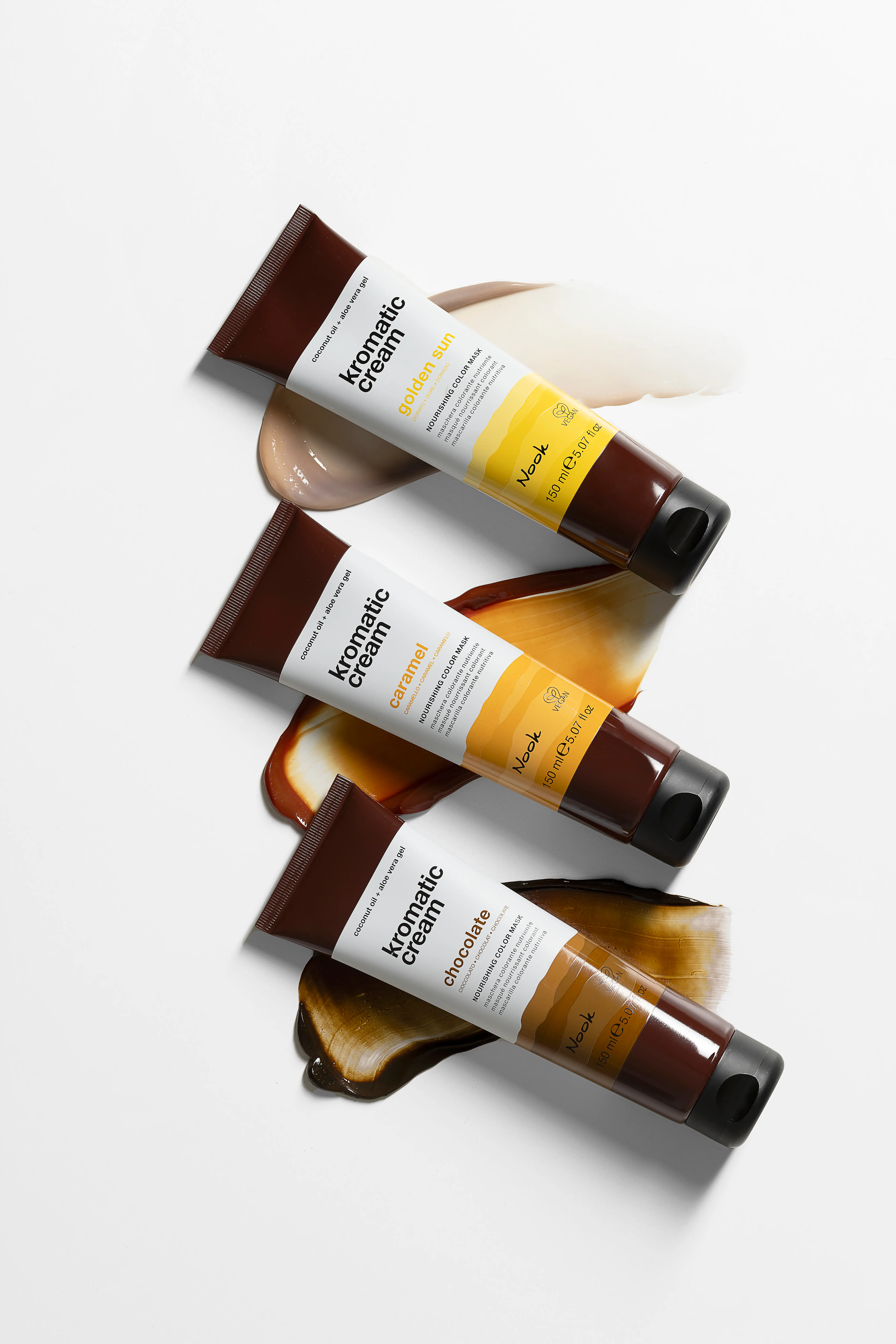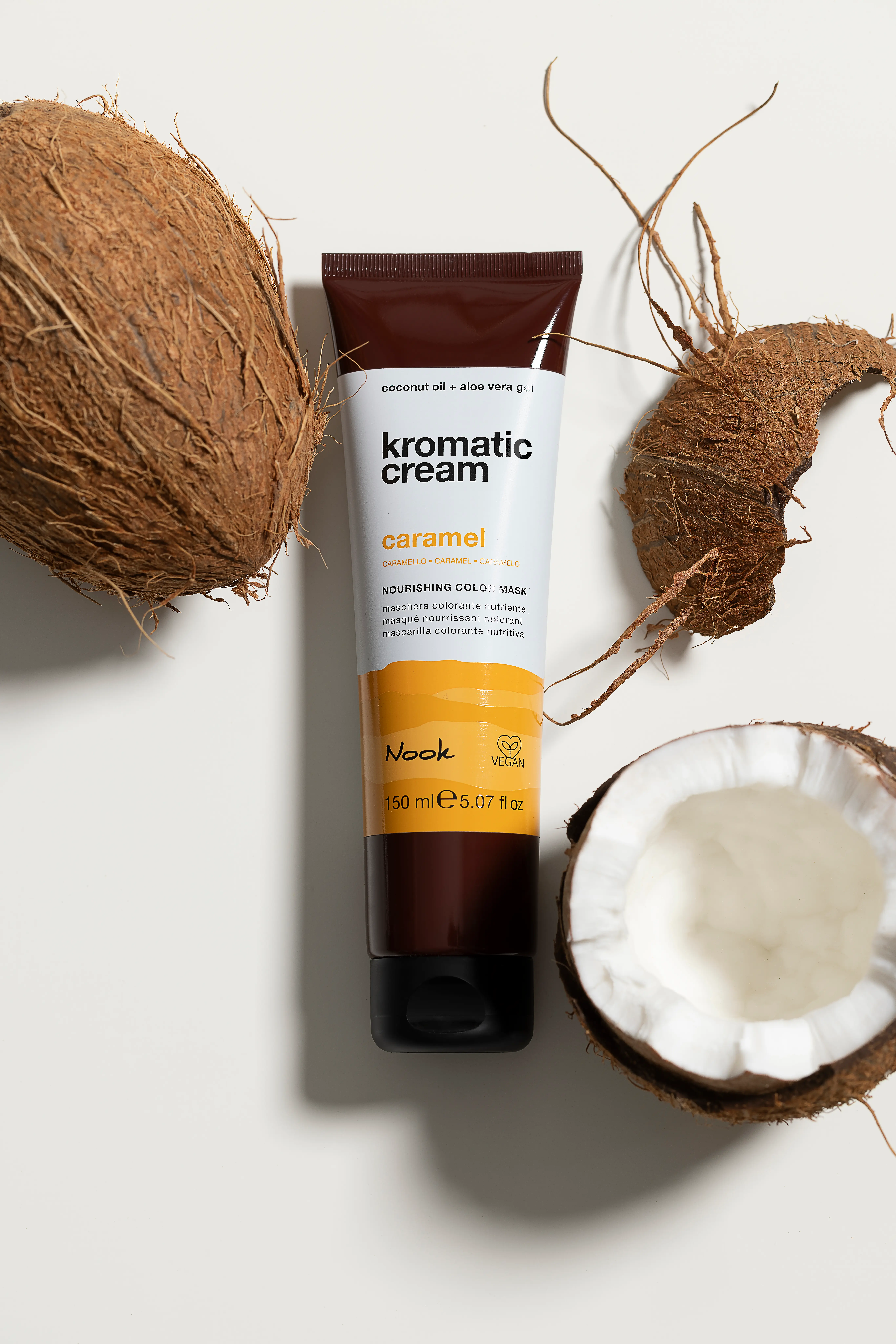 La maschera nutriente Caramel ravviva le tonalità dal biondo al castano medio conferendo calde e brillanti sfumature rame caramello.